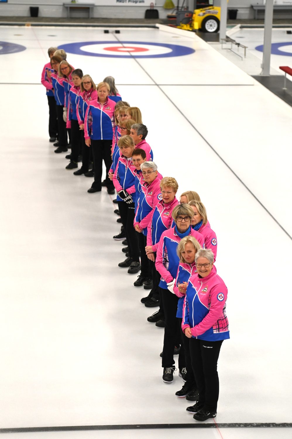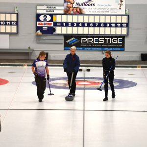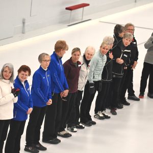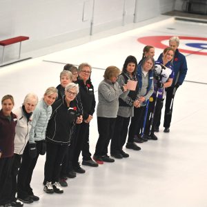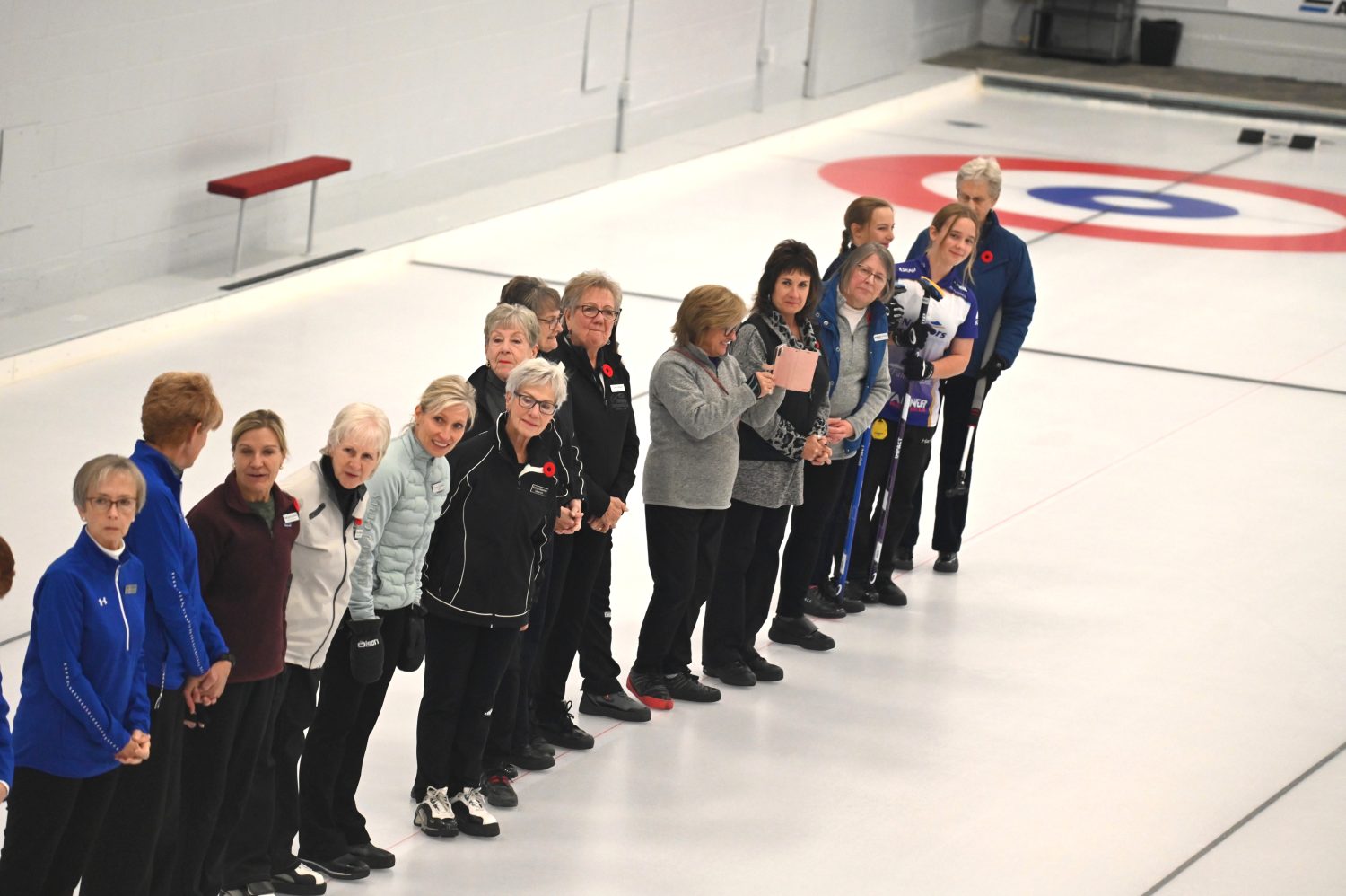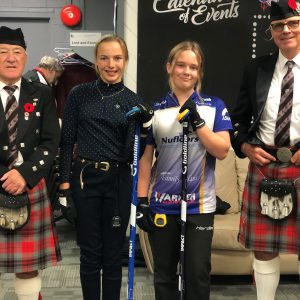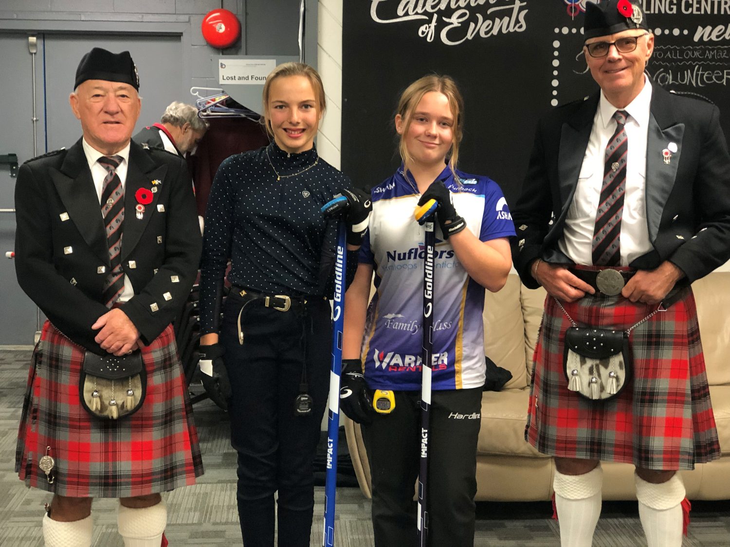 Led by 2 distinguished Shuswap Pipes and Drums pipers, the ladies lined both sides of Sheet #2 to cheer on Lois Angle (our oldest active curler) throw the ceremonial first rock, swept by Junior curlers Jana Mint and Callista Drury who guided it to the feet of our honorary broom holder Janny Merwin.