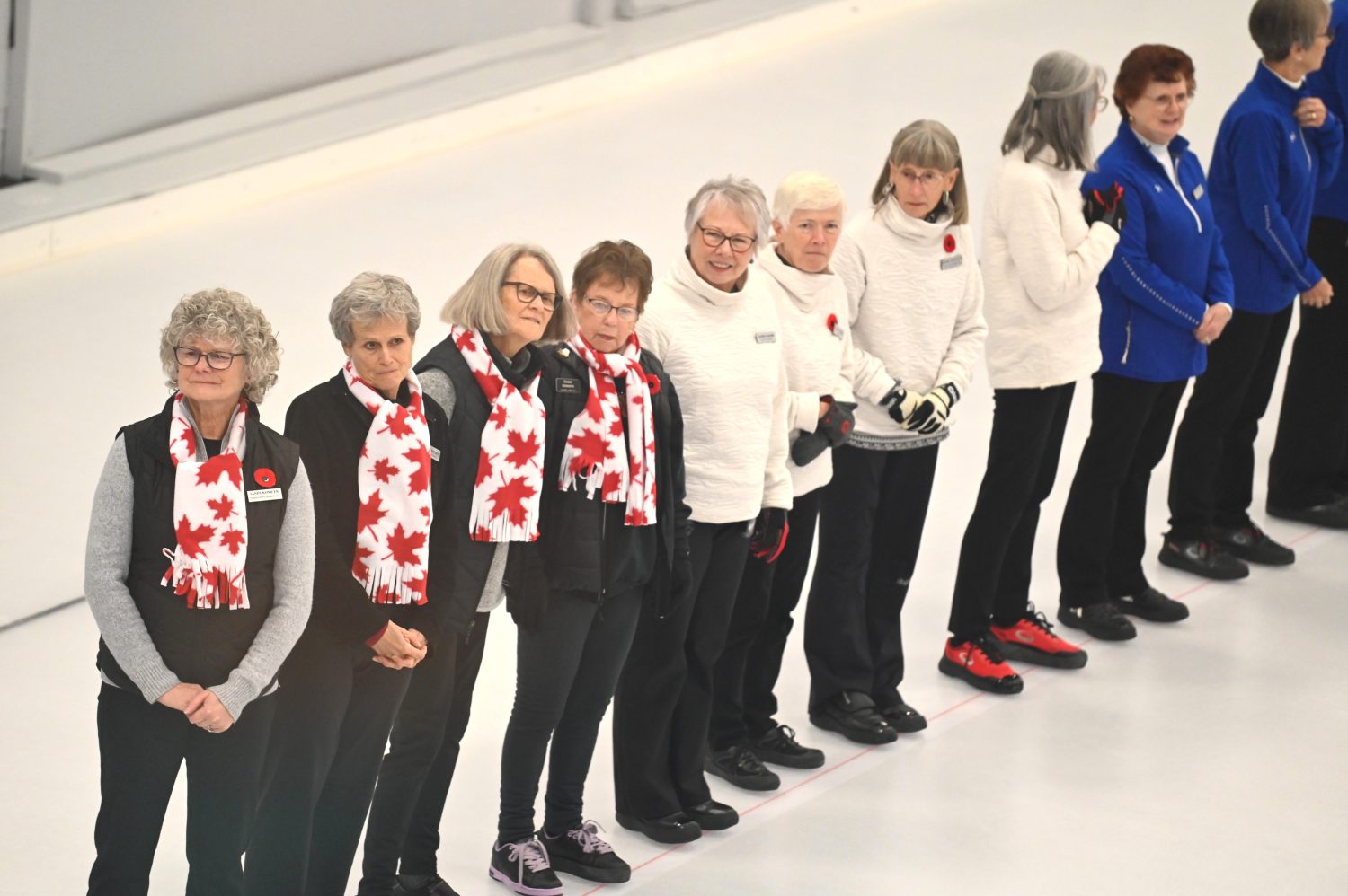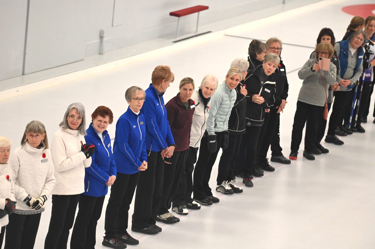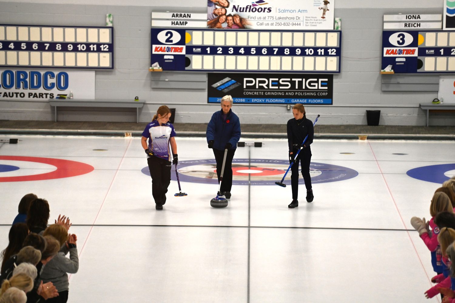 Led by 2 distinguished Shuswap Pipes and Drums pipers, the ladies lined both sides of Sheet #2 to cheer on Lois Angle (our oldest active curler) throw the ceremonial first rock, swept by Junior curlers Jana Mint and Callista Drury who guided it to the feet of our honorary broom holder Janny Merwin.
